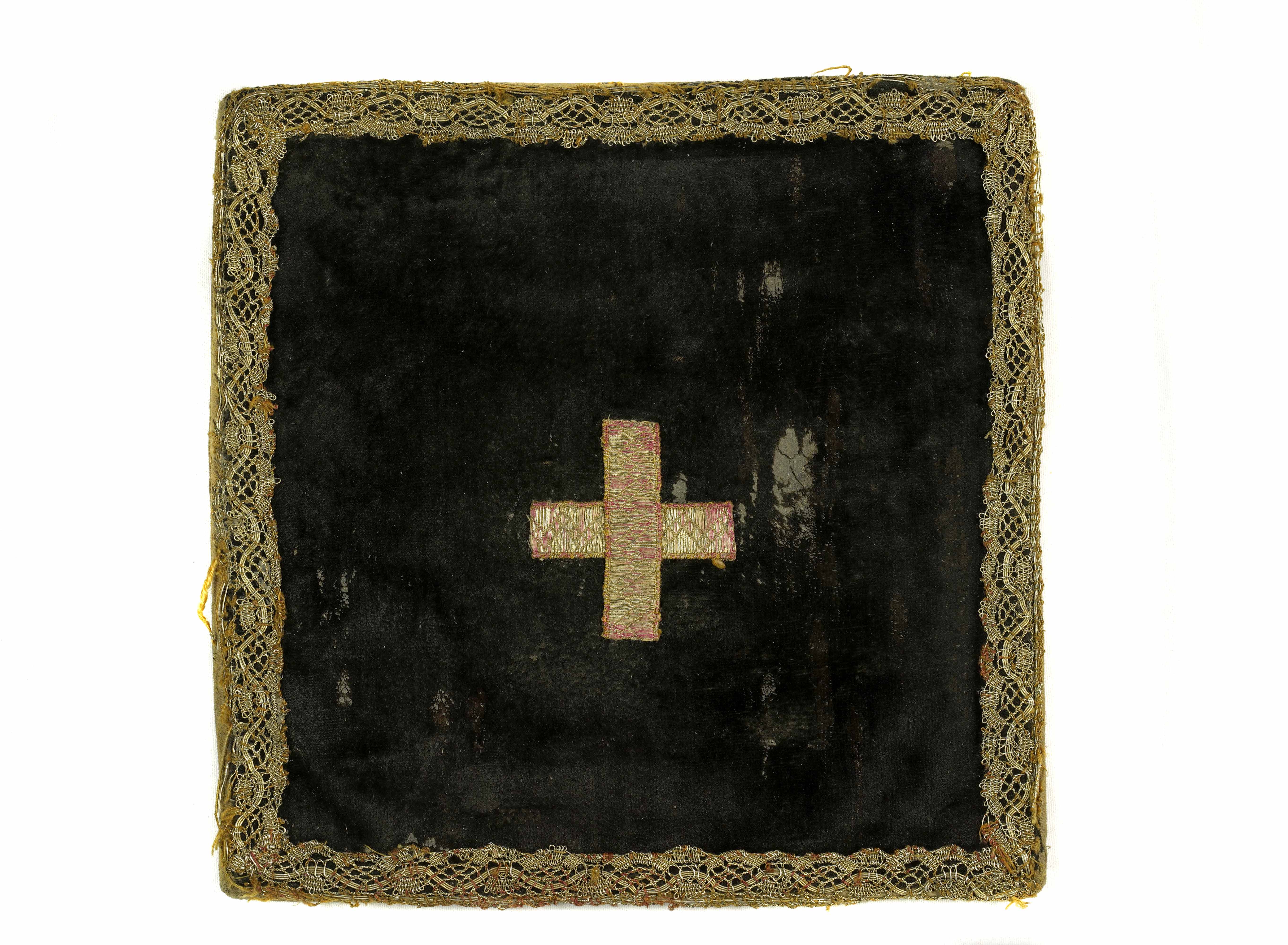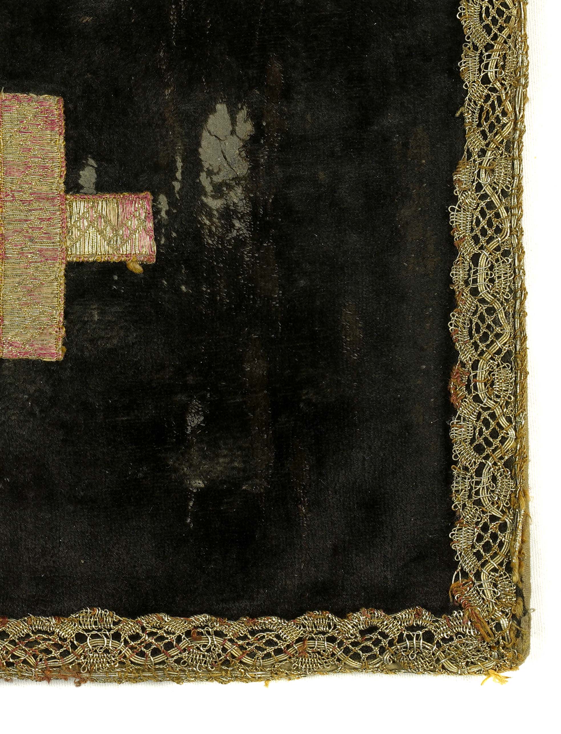 Bursa z czarnego, gładkiego aksamitu. Przy krawędziach obszyta koronką klockową z nici metalowych w kolorze złotym. W centrum krzyżyk z galonu. Podszewka z czerwonej bawełny.