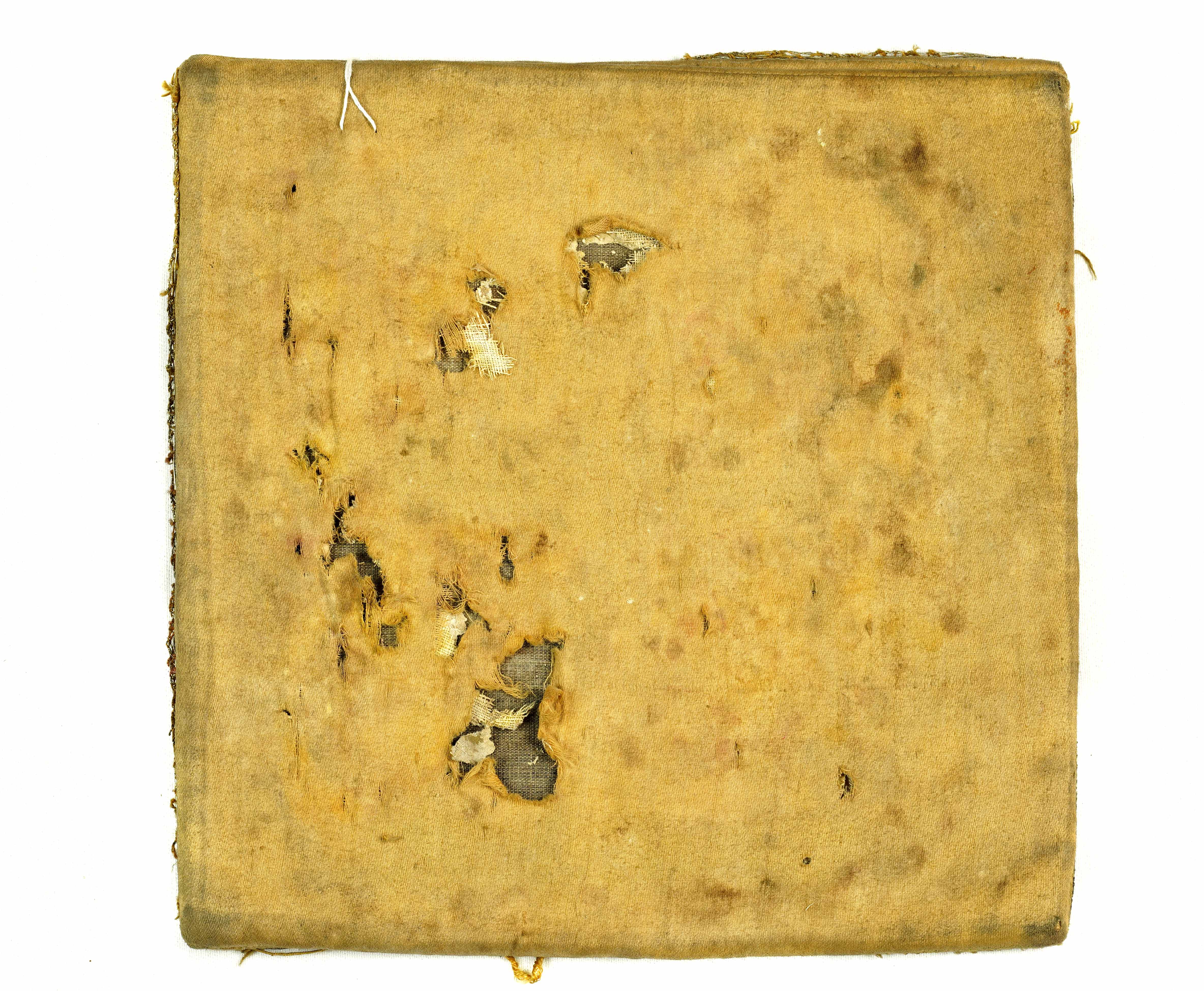 W centrum duże plamy z wosku na aksamicie. Koronka lekko skorodowana, nici metalowe częściowo wykruszone. Podszewka mocno wypłowiała i zabrudzona. Na jej powierzchni liczne rozdarcia.