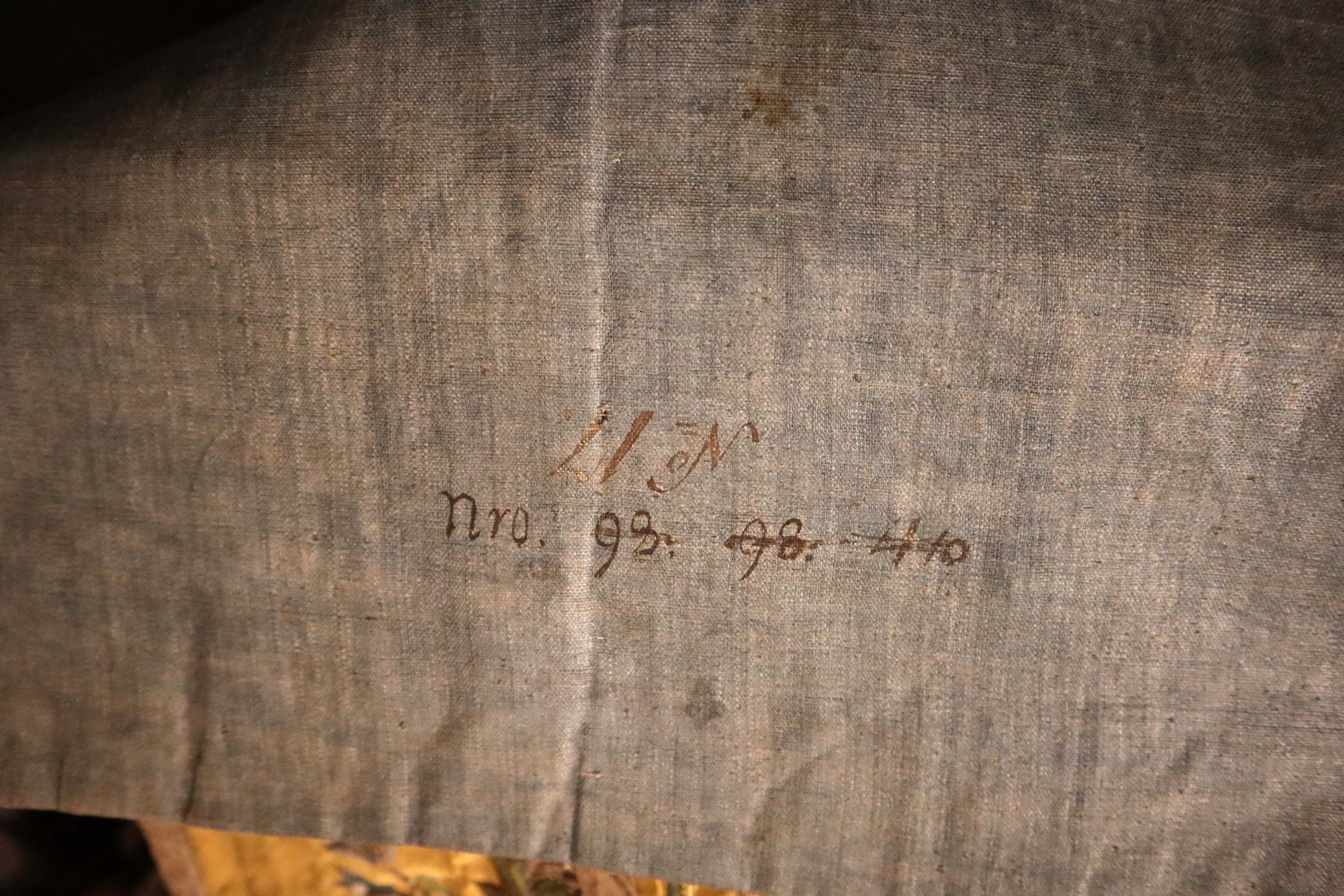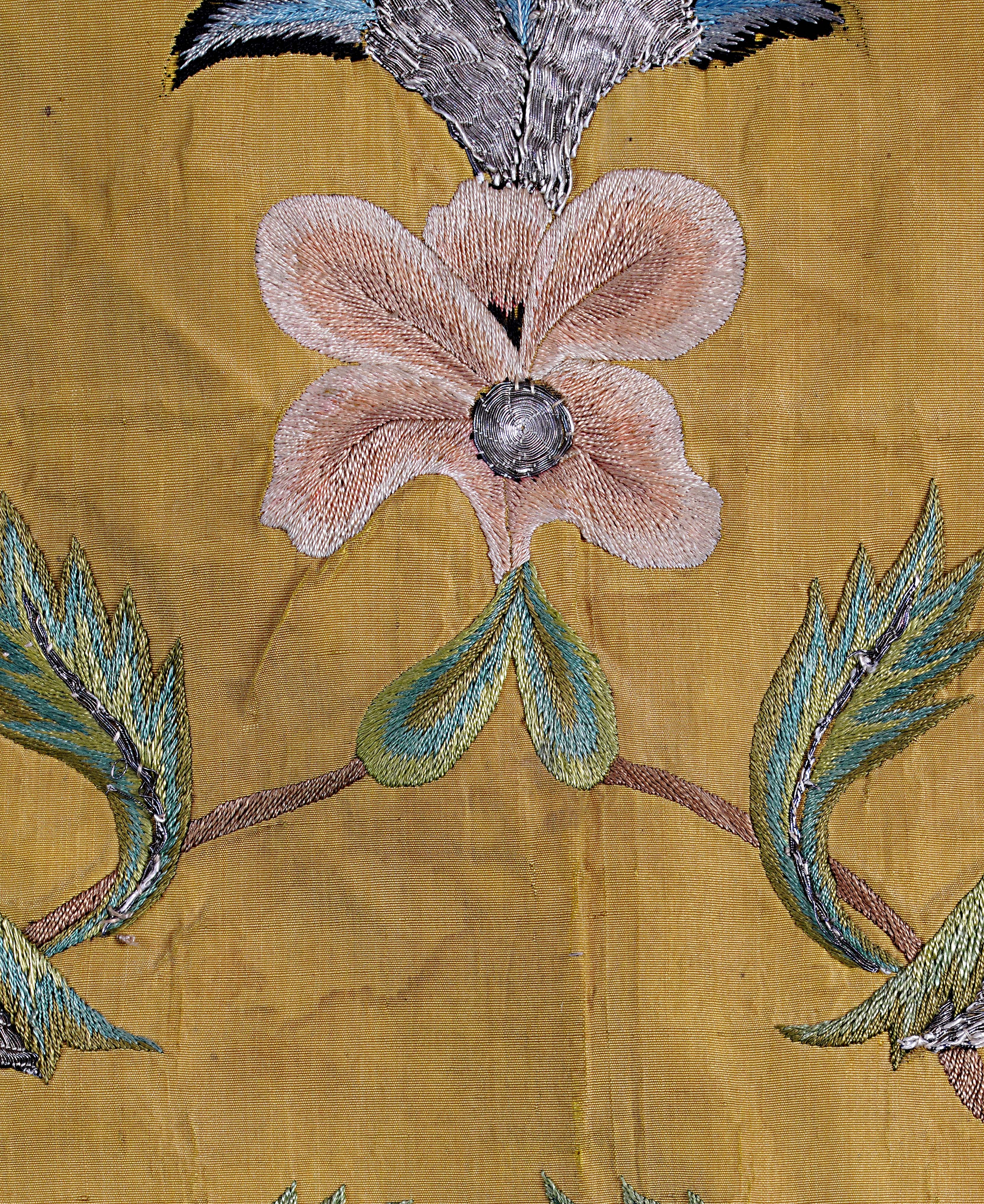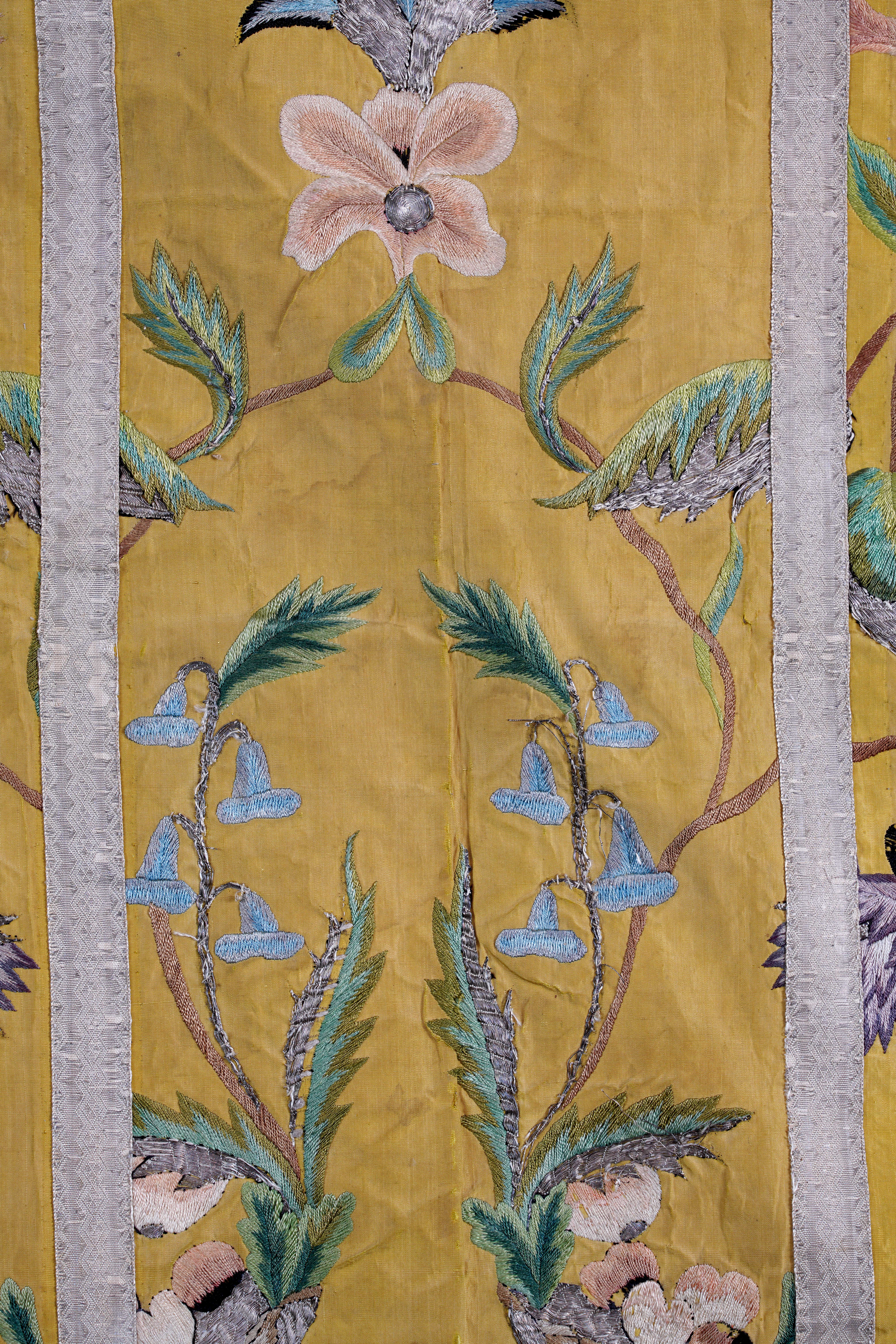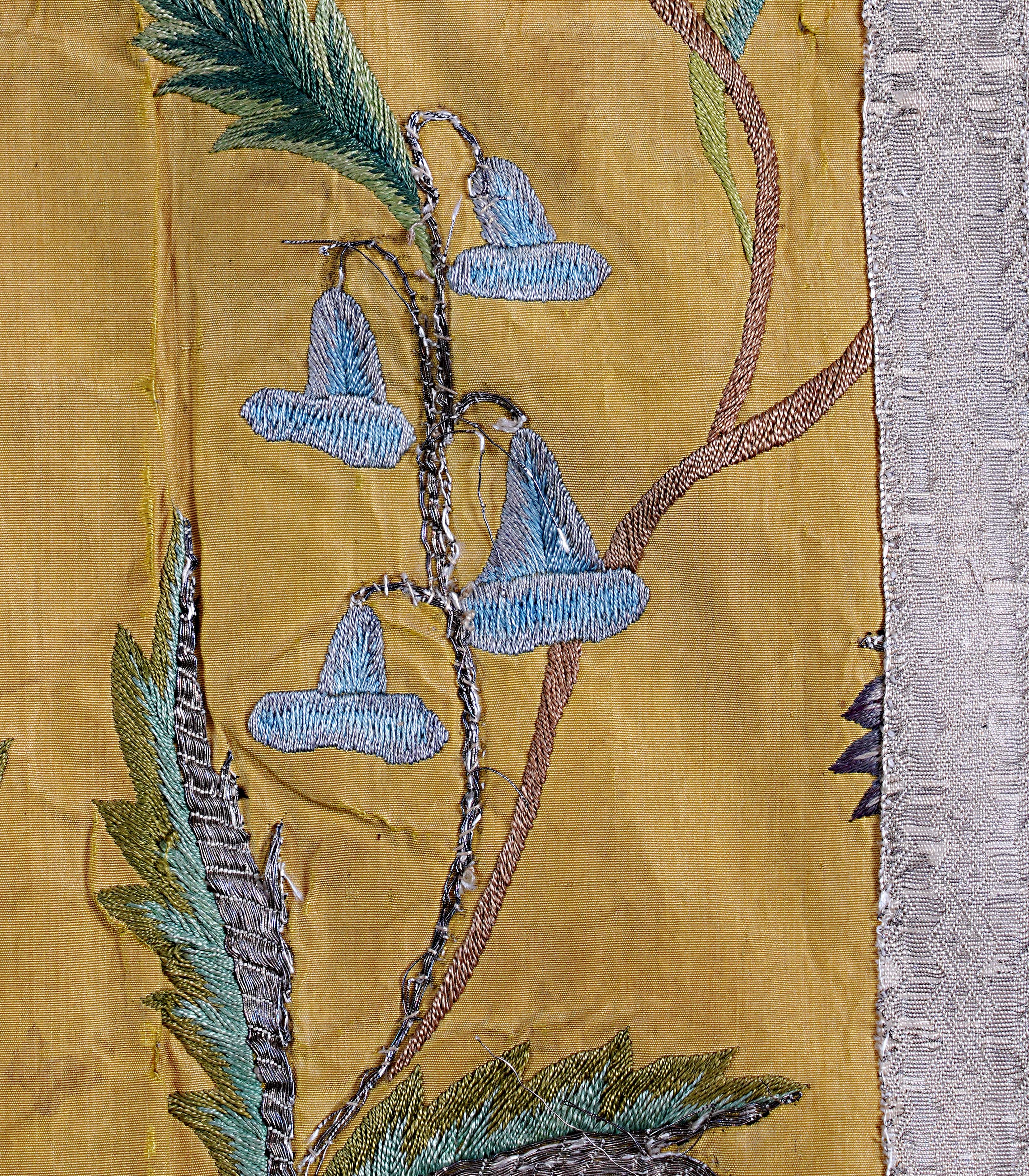 Przód ornatu wypłowiały i bardziej zniszczony – nici metalowe wykruszone. Częściowo luźne nici jedwabne. Na całym ornacie nici metalowe są skorodowane. Podszewka wypłowiała.