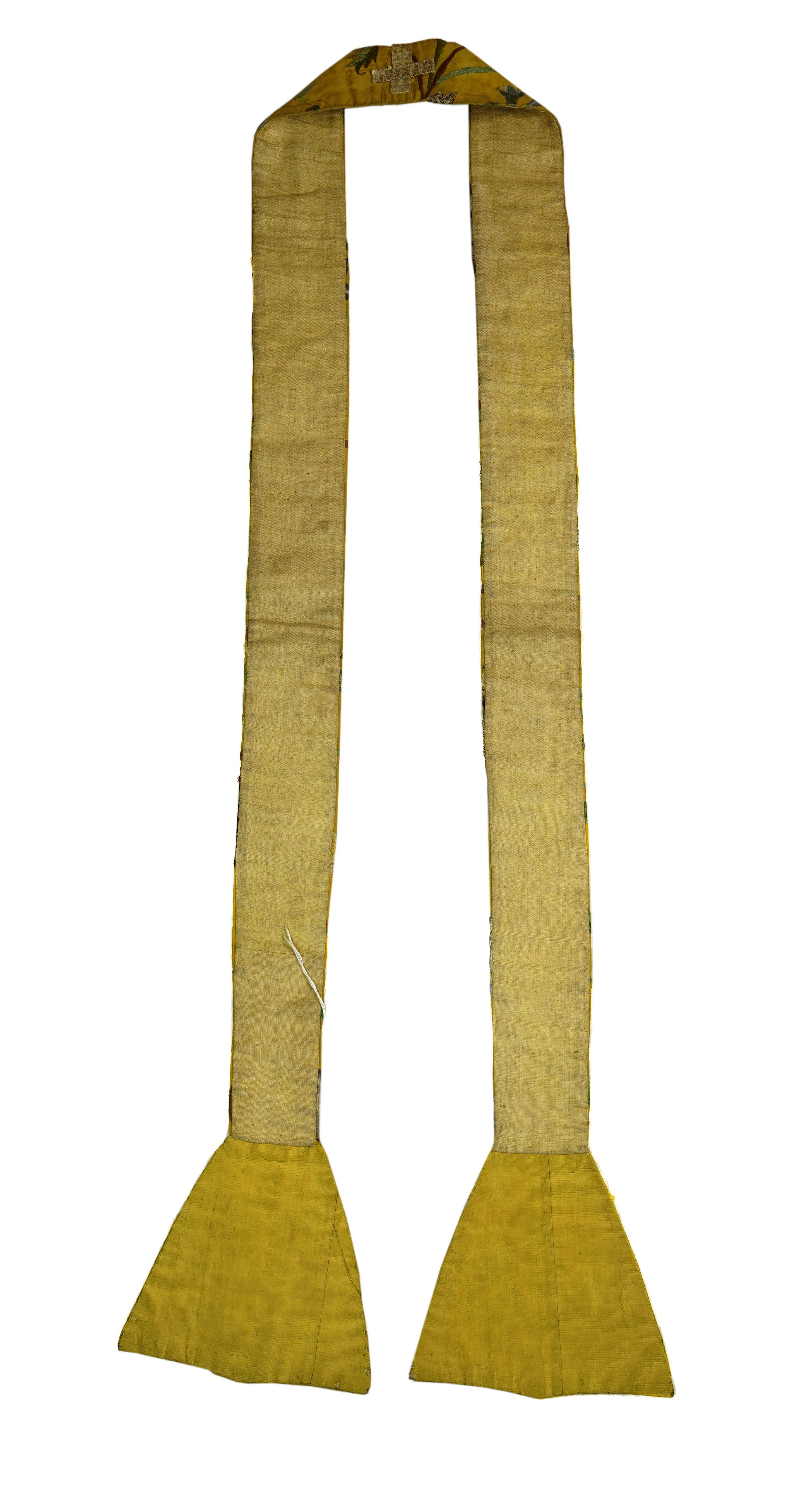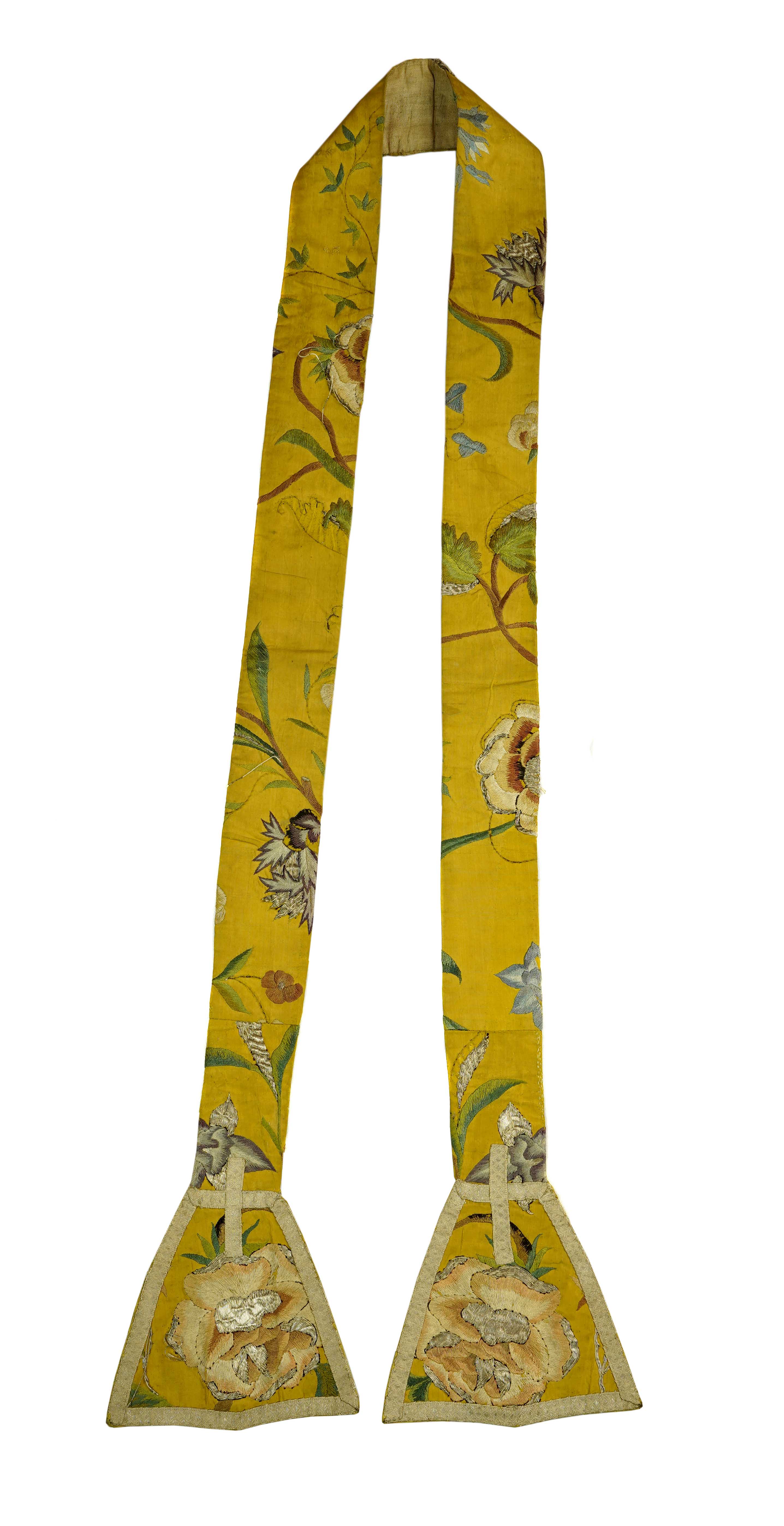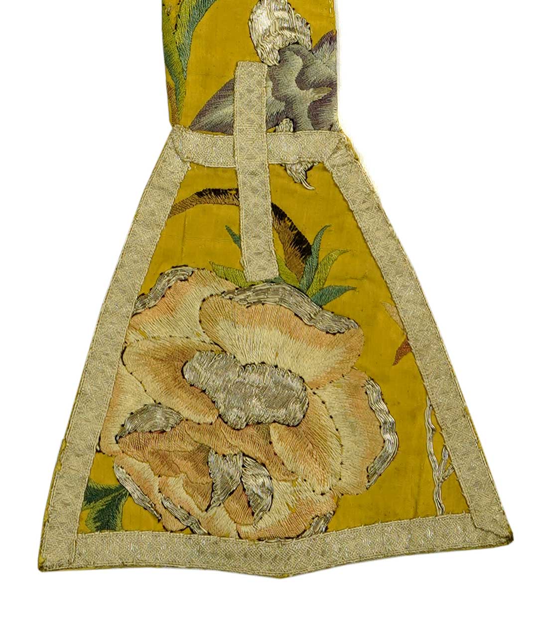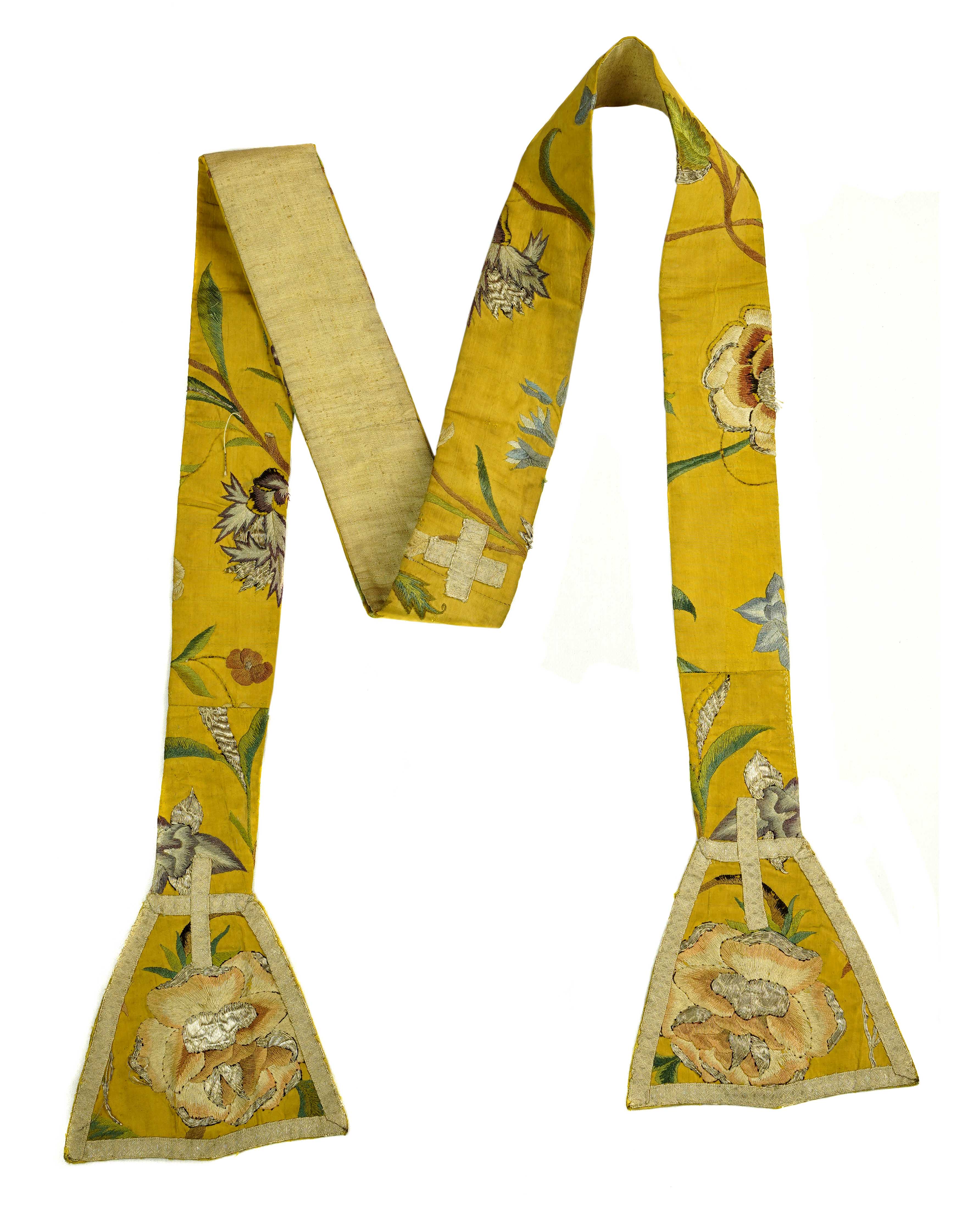 • Stuła z żółtego rypsu jedwabnego. Pokryta haftem wielobarwnym o motywie stylizowanych wici kwiatowych z chabrami, dzwonkami i makami. Liście i główni kwiatowe cieniowane są nićmi srebrnymi w technice haftu kładzionego. Paletki o formie łopatowej obszyte są galonami z nici metelowych. Obszycie górnej krawędzi paletek stanowi jednocześnie poziomą belkę krzyża. Podszewka z płótna beżowego.