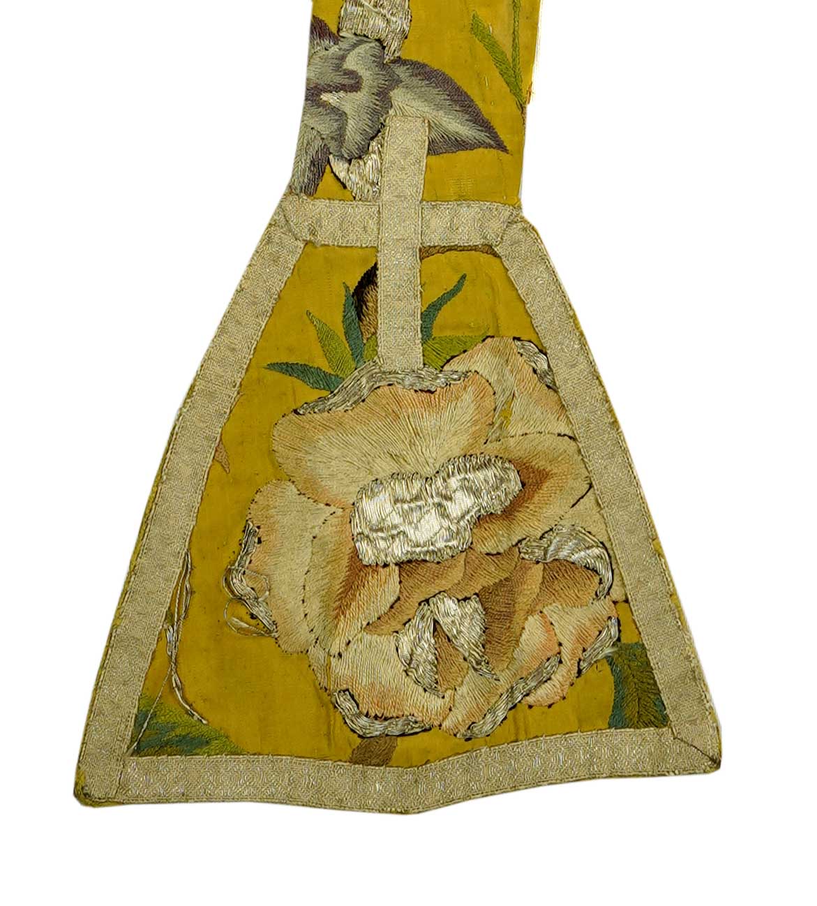 • Ryps jedwabny; haft jedwabiem ściegami satynowym, cieniowanym i haft kładzionym nićmi srebrnymi, galon.